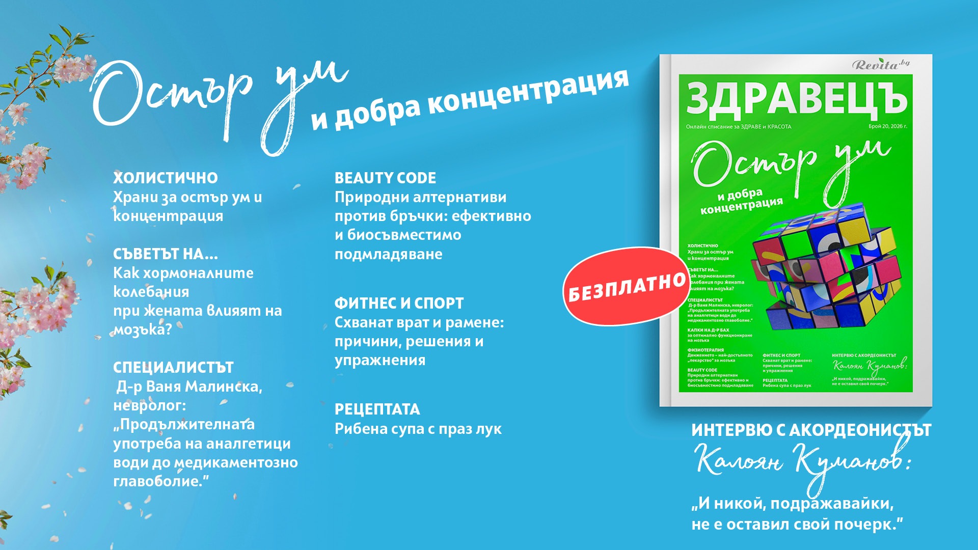 По темата за мозъчното здраве разговаряме с д-р Малинска – неврологът, който ще ви поясни какво е медикаментозно главоболие и ще ви даде насоки как ума ви да работи на максимални обороти. Представяме ви и едно интервю, вълнуващо всяка бъдеща майка - за изследванията и пренаталните тестове по време на бременност. Гост на първия ни пролетен брой е акордеонистът Калоян Куманов, който след десет години в Испания избира да твори в родната си България.