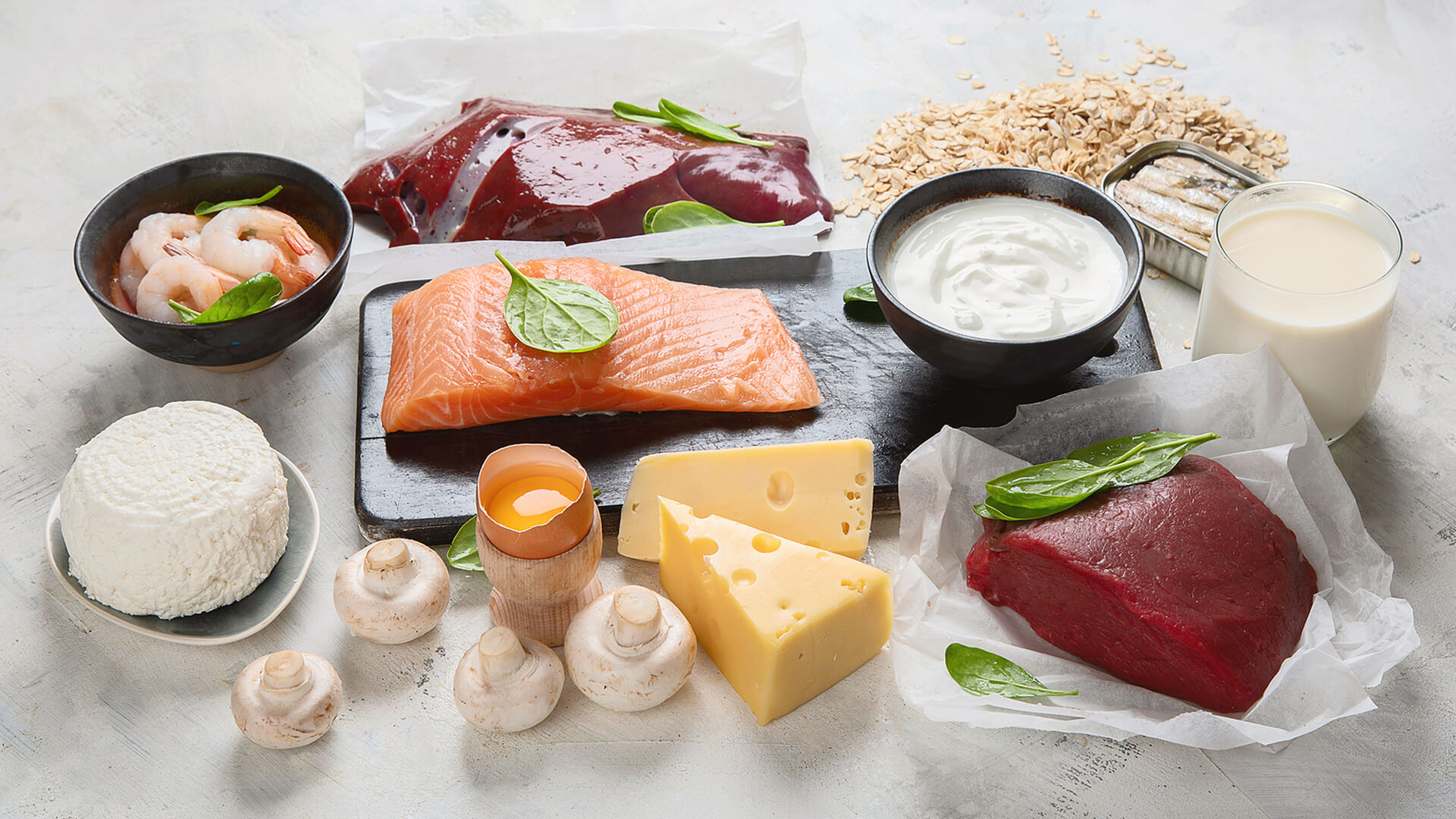 Храни, богати на рибофлавин, включват яйца, черен дроб и месо, обогатени зърнени продукти и хляб, млечни продукти като мляко, кисело мляко и сирене, миди, сьомга, бадеми и слънчогледови семки, боб, спанак, гъби и домати.