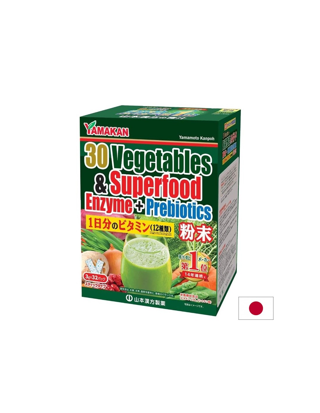 Именно тази философия е в основата на 30 Domestic Grown Vege & Super Food + 12 kind Vitamins – 30 японски зеленчуци + суперхрани + 12 витамини, резултат от вековна мъдрост, подкрепена със съвременна технология. Това е уникална прахообразна формула с високо съдържание на хлорофил, ензими, пробиотици, адаптогени и витамини, които подхранват организма в дълбочина и подпомагат цялостното вътрешно равновесие. Продуктът е разработен от Yamamoto Kanpoh Pharmaceutical – японска компания с над 100-годишна традиция в създаването на лечебни и функционални билкови формули, чието име се свързва с качеството, чистотата и научен подход към традиционната японска фитотерапия. Формулата съчетава силата на 30 подбрани растителни съставки – местни зеленчуци, суперхрани, ферментирали екстракти и постбиотични компоненти, плюс внимателно подбран комплекс от 12 витамина, осигуряващи ежедневна нутритивна подкрепа. Всеки елемент в състава е избран с конкретна цел: младите ечемичени листа доставят хлорофил и минерали, ферментиралите продукти стимулират храносмилането и чревния баланс, а витаминният микс обхваща ключови хранителни вещества с доказани ползи за метаболизма, имунитета и жизнения тонус.