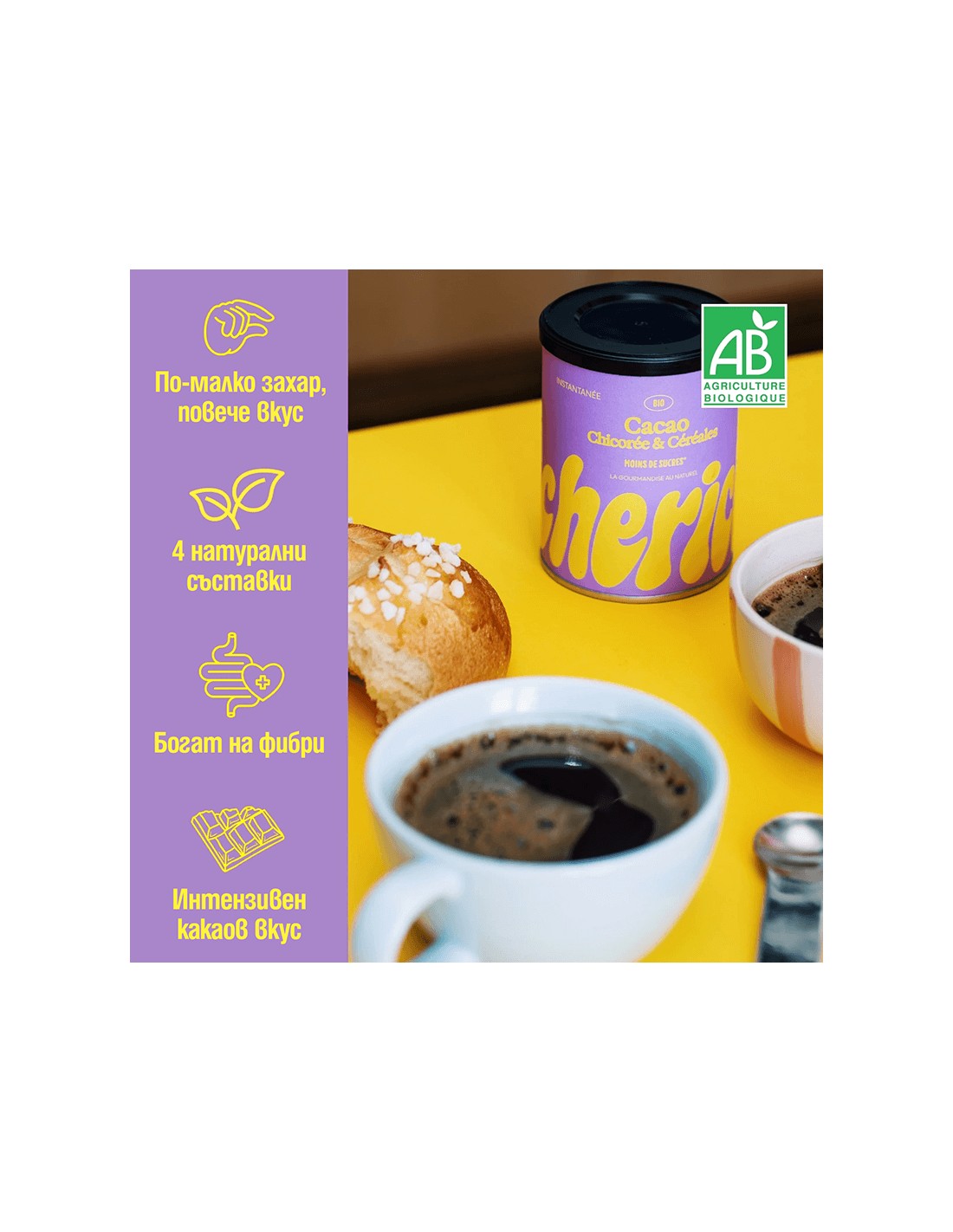 Гурме разтворима напитка без кофеин с интензивен какаов вкус и фини карамелено-лешникови нотки от цикорията. Съдържа 4 натурални съставки, без добавена захар и богата на фибри. Идеална за топла и успокояваща пауза по всяко време на деня