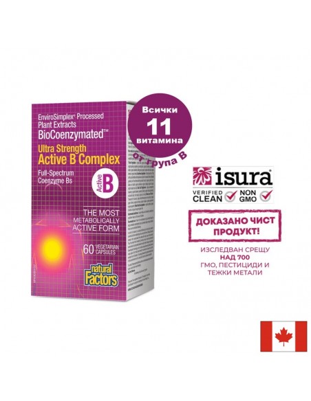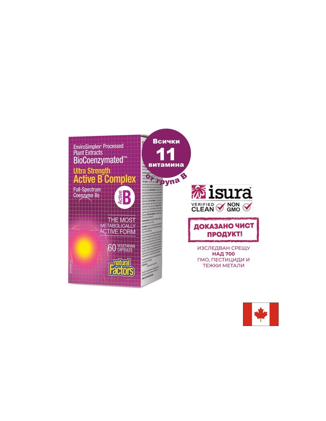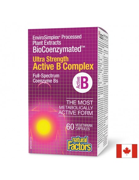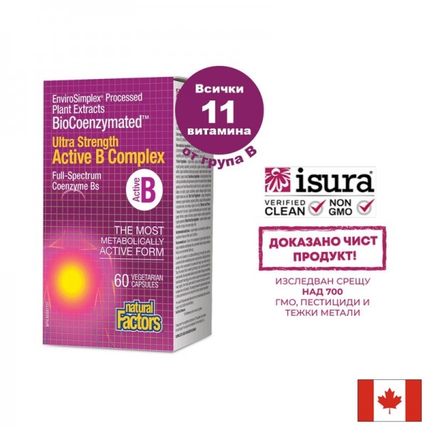 Продуктът Active B Complex BioCoenzymated™ на Natural Factors съдържа комплекс от всички витамини на група В, представени в техните биоактивни форми, които не се нуждаят от преобразуване в организма и бързо компенсират дефицита. Витамин В комплексът на Natural Factors е с най-висока степен на абсорбция и постига отлична бионаличност и максимално разпределение в клетките и тъканите. Ефектът му е подсилен от двата витаминоподобни нутриента холин и инозитол, както и от специални плодови, зеленчукови, билкови и водораслови екстракти.