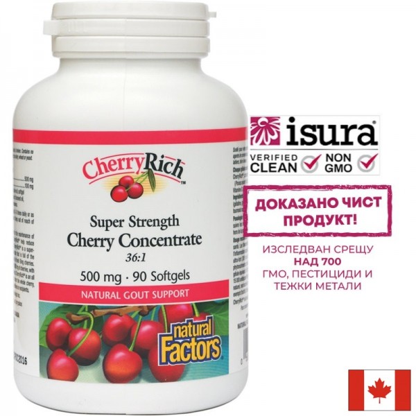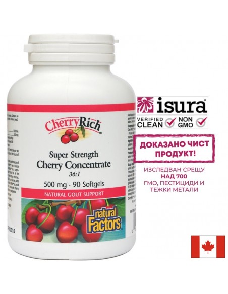 Продуктът на Natural Factors съдържа натурален концентрат от череша, патентован като CherryRich™ в комбинация с оптимално усвоимата форма на витамин С – калциев аскорбат, която не дразни стомаха. Изключително ефективно средство за облекчаване на симптомите при подагра. Спомага за намаляване образуването на пикочна киселина, понижаване на нивата й и изхвърлянето й през бъбреците.
