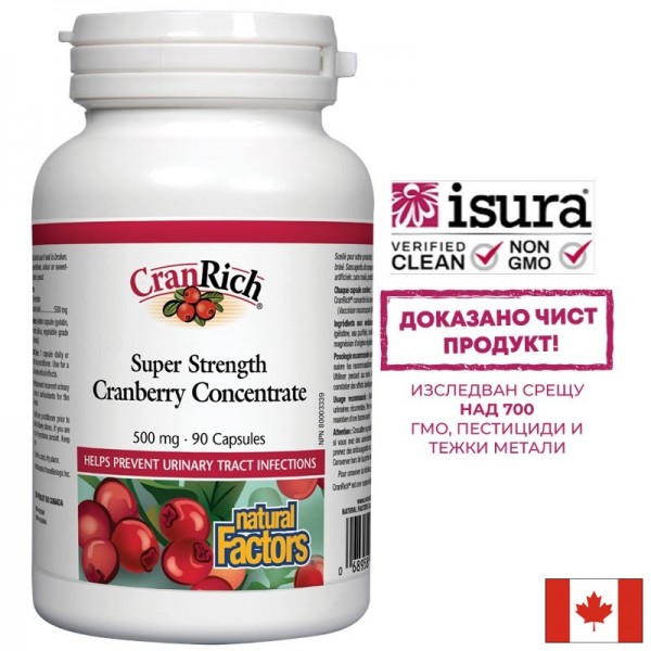 CranRich® е патентован, изцяло натурален, изключително мощен концентрат от плодовете на червената боровинка (Vaccinium macrocarpon). Потенцията му е 36:1, което означава, че 1 грам екстракт съдържа 36 грама червена боровинка от 100% сок. Приемът на CranRich® се препоръчва за профилактика и терапия на уринарни инфекции. Концентратът може да се прилага самостоятелно или в комбинация с назначените антимикробни средства. Продуктът се предлага в икономична опаковка от 90 капсули!