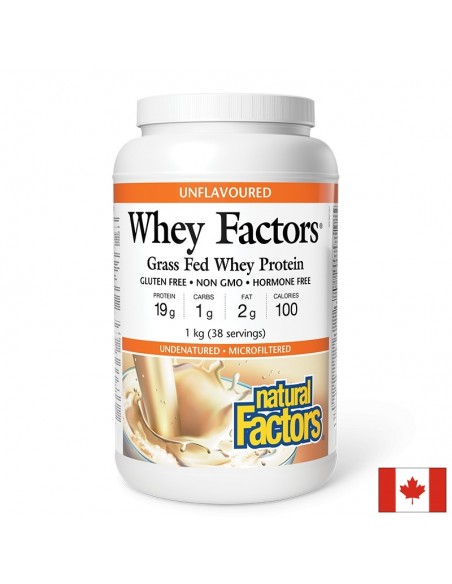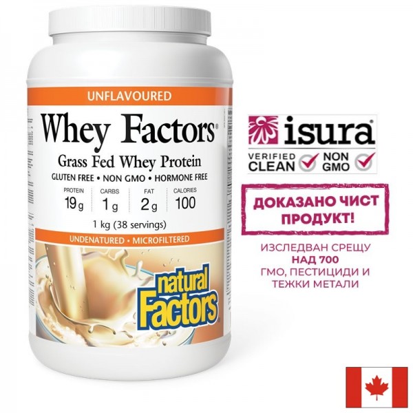 Whey Factors® Grass Fed Whey Protein от Natural Factors е чист източник на висококачествен суроватъчен протеин, който осигурява подкрепа за развитието и възстановяването на мускулите, както и за имунната система. Суроватъчният протеин на Whey Factors се добива от говеда, хранени с трева, като се използва естествена микрофилтрация с кръстосан поток и специални грижи по време на обработката за защита на неденатурирана суроватка. Не съдържа изкуствени подсладители, ГМО съставки и rBGH & BSE. Формулата е допълнена с комплекс от храносмилателни ензими, от естествени източници, който потенцира способността на протеина да подобрява мускулната структура, особено след интензивни тренировки.