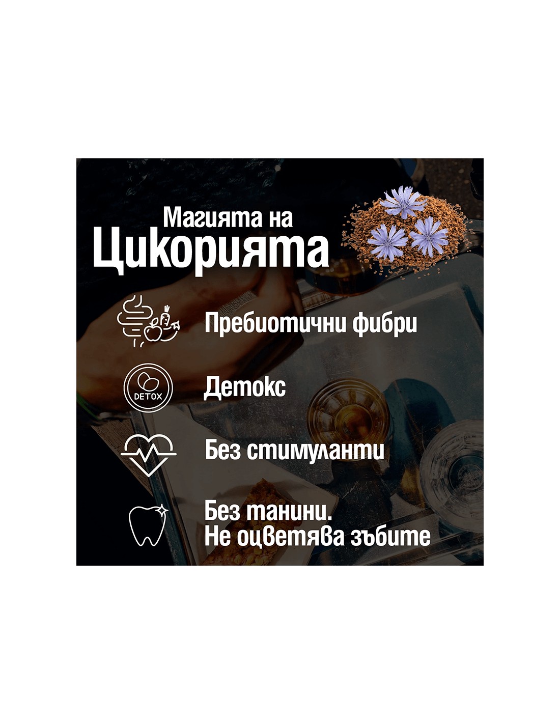 Безкофеинова разтворима алтернатива на кафето с нежен вкус и нотки на карамел и лешник. Органичен състав, без добавена захар, богат на пребиотични фибри (инулин). Подходяща за всяка част от деня – нежна към стомаха и без горчив вкус