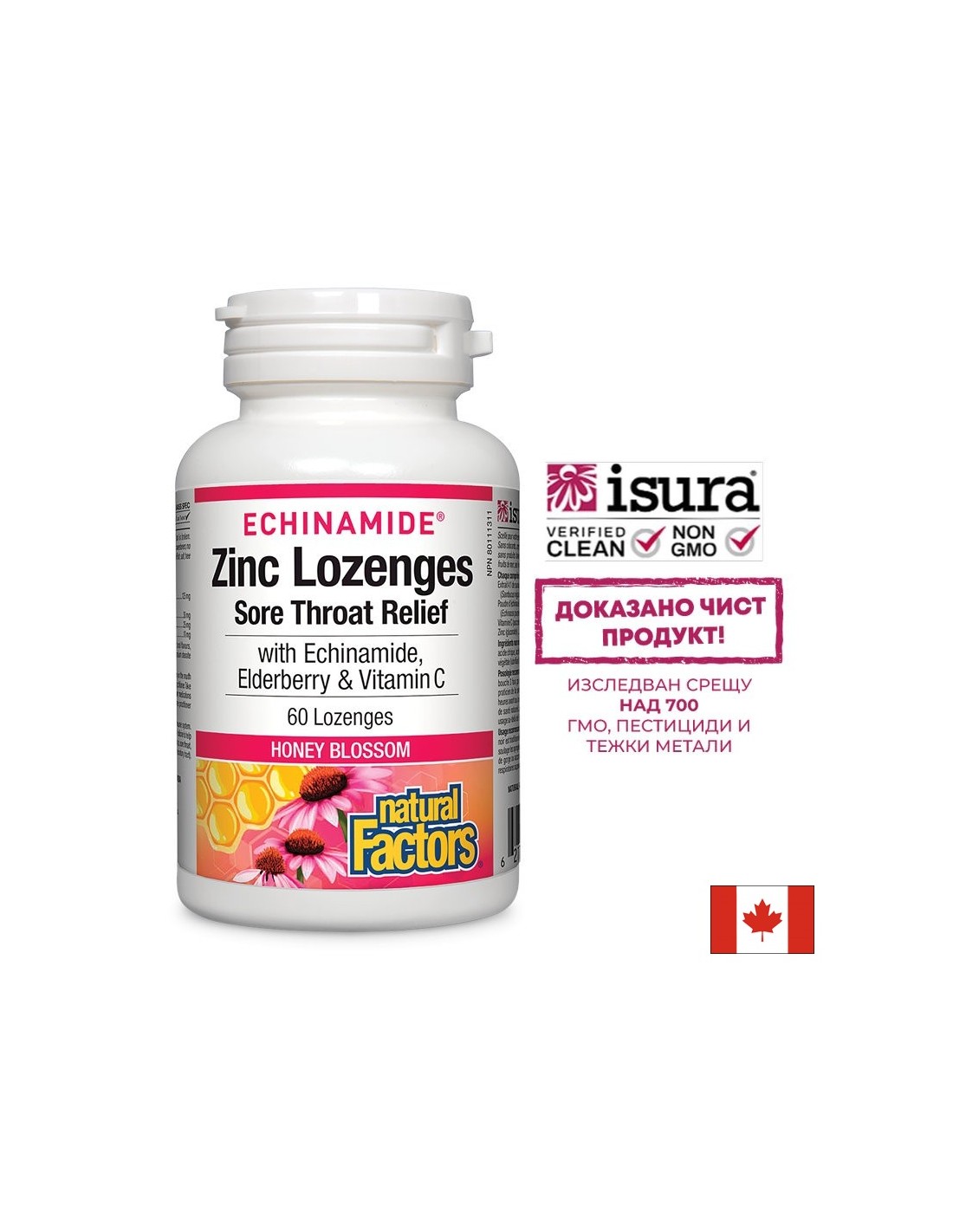 Echinamide® Zinc lozenges sore throat relief Цинк, ехинацея, витамин С и черен бъз 60 таблетки за смучене с вкус на цветен мед