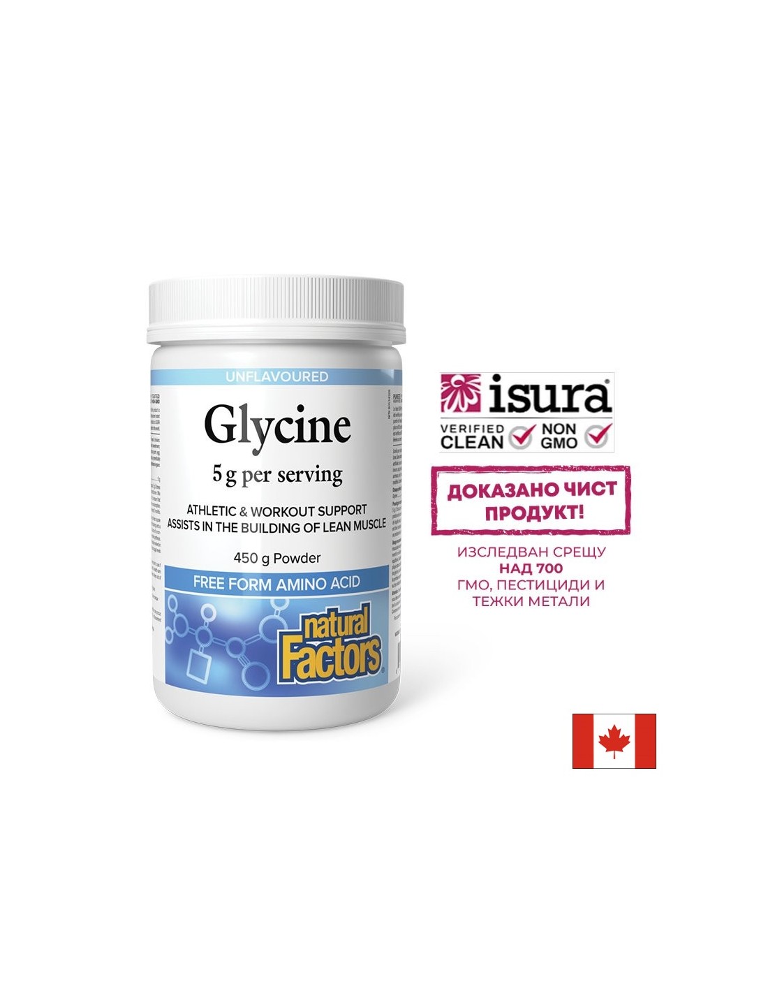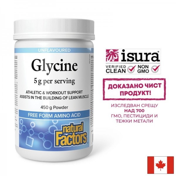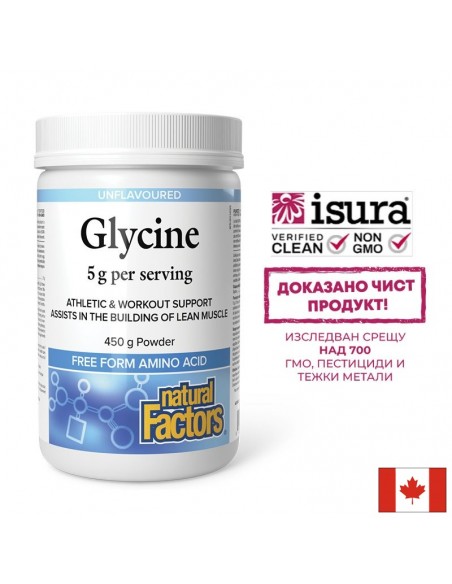 Глицин 5000мг на прах от Natural Factors представлява висококачествен, чист и веган източник на тази неесенциална аминокиселина, в подкрепа на спортната активност