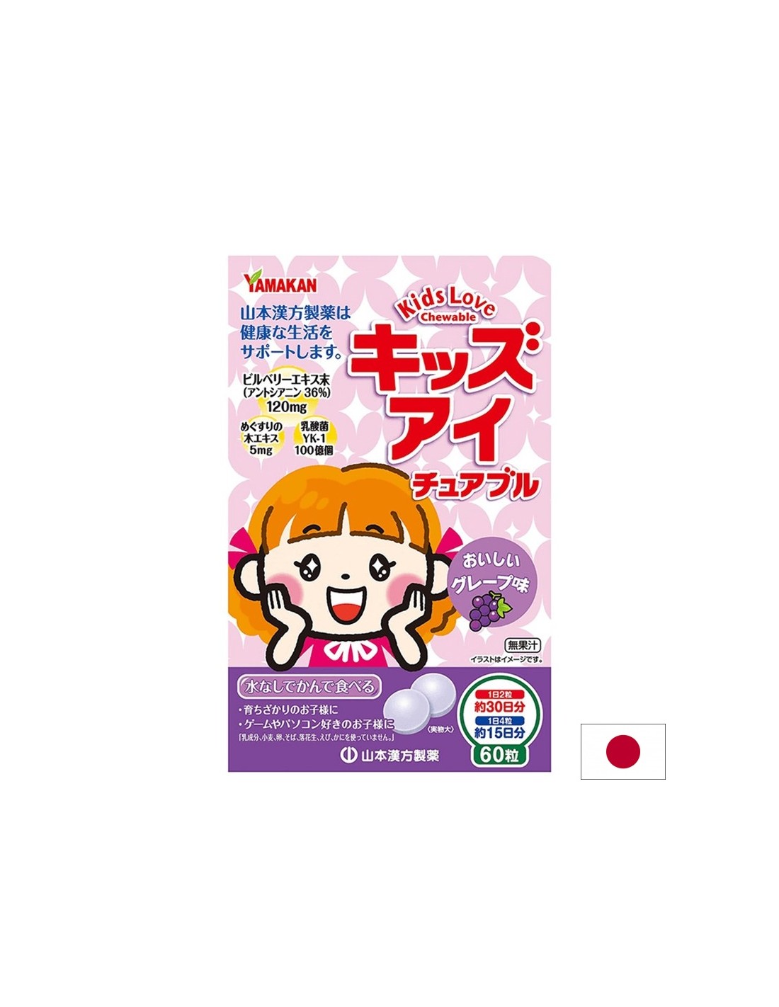 Kids Eye Chewable е хранителна добавка под формата на дъвчащи таблетки с плодов вкус, създадена от японската компания Yamamoto Kanpoh Pharmaceutical – производител с над 100-годишна традиция в областта на източната фитотерапия и функционалното здраве. Формулата е разработена специално за деца, които прекарват значително време пред екрани, и има за цел да подпомогне нормалното функциониране на очите в условията на съвременното дигитално облъчване. Включително да облекчи усещането за умора, да поддържа здравето на ретината и да защити слъзния филм от дехидратация.