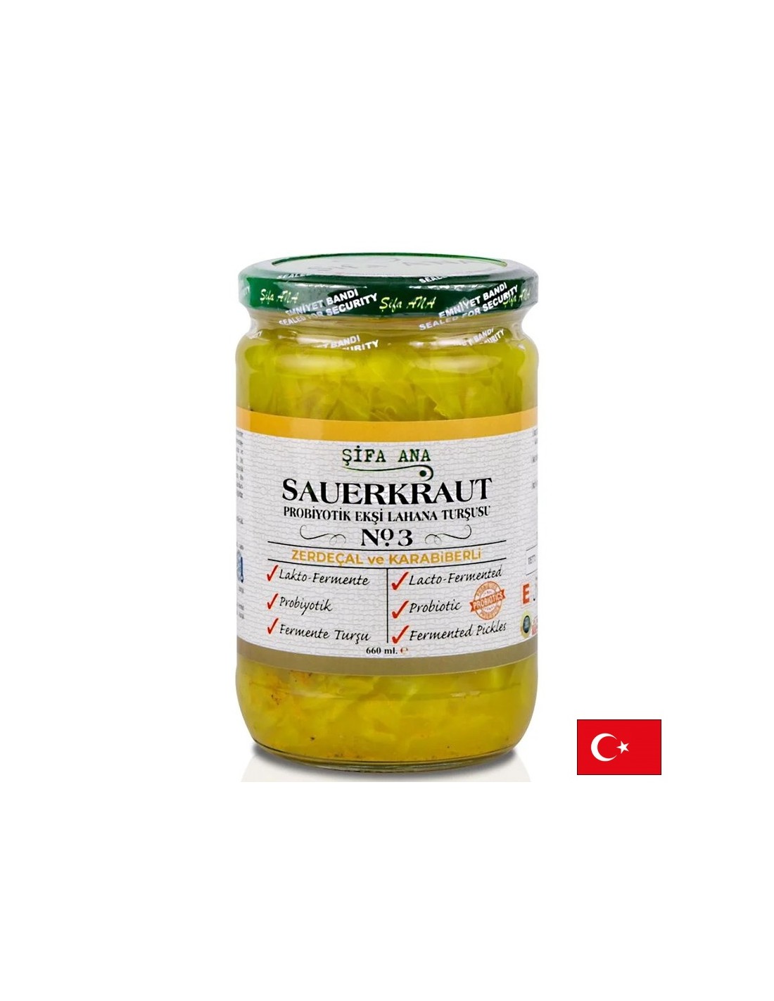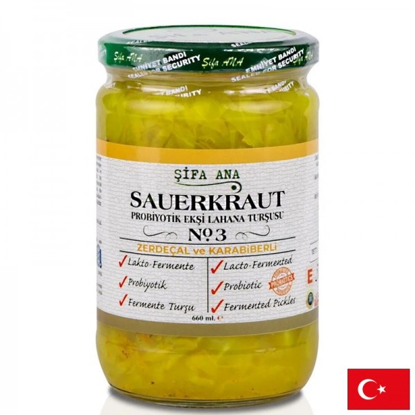 Непастьоризирана туршия от бяло зеле с куркума и черен пипер, приготвена чрез естествена ферментация. Съдържа живи пробиотици и подправки с антиоксидантен ефект – в подкрепа на доброто храносмилане и имунната система