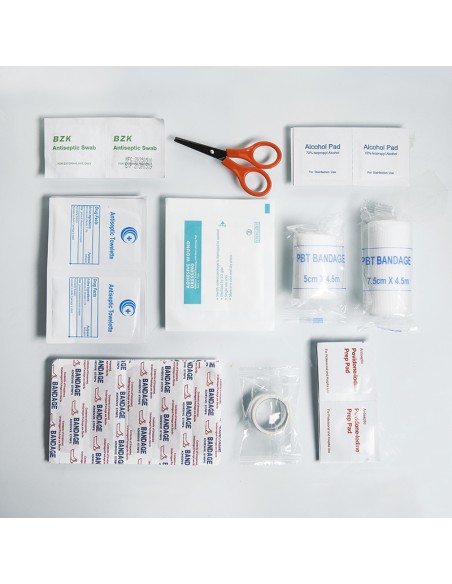 Практичен комплект с всичко необходимо за бърза реакция при леки наранявания и инциденти. Лек и удобен за съхранение в кола, офис, раница или у дома