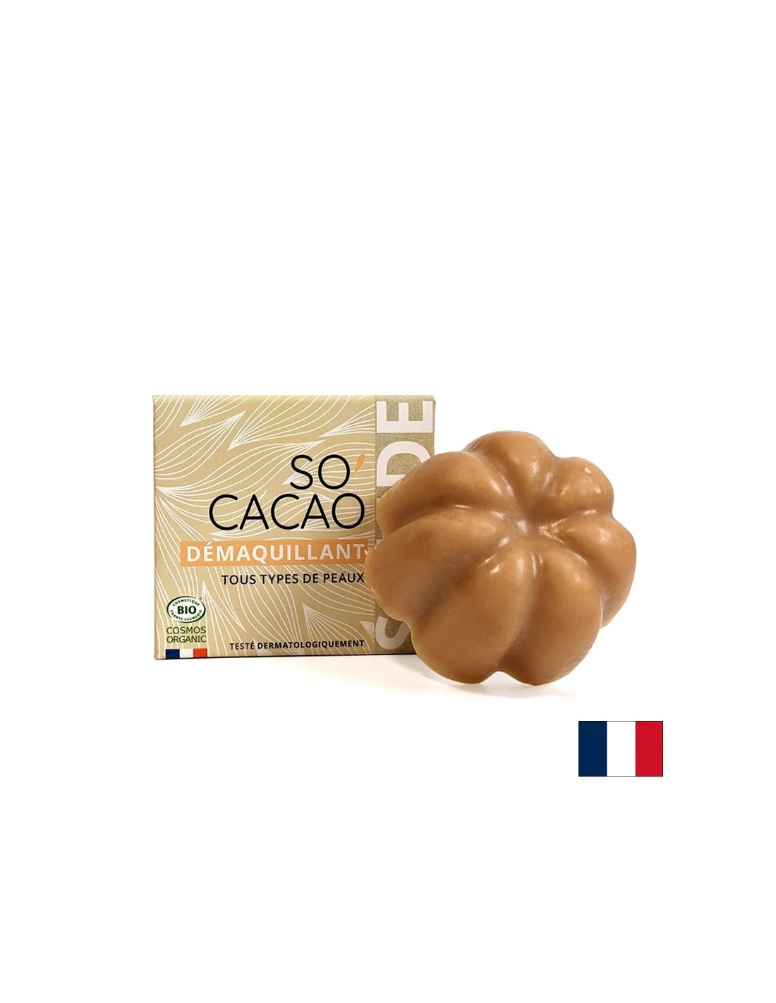 Базата от розова глина, към която са добавени още токоферол, масла от жожоба и слънчогледово семе, е подходяща за всеки тип кожа, в това число и за най-чувствителната. Всички съставки са със 100% естествен произход. Дерматологично тестван и без аромат, органичният твърд препарат за премахване на грим се разпенва лесно и може да се използва 3 пъти по-дълго от традиционните почистващи грима средства. Образуваната след намокряне с вода и масажни движения млечна емулсия премахва всички видове грим, като не люти на очите. Екологичен и икономичен, твърдият препарат за премахване на грим Bio So'Cacao е ръчно изработен в Прованс, Франция. Той е без аромат, с естествен бледорозов цвят и без синтетични перли. Гамата от натурална твърда козметика So'Cacao е формулирана с органично какаово масло без вода. Продуктът е тестван под дерматологичен контрол. Оставя кожата чиста, без чувство на опъване.