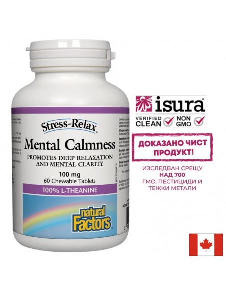 Mental Calmness® съдържа над 99% чист, клинично тестван L-теанин – Suntheanine®, създаден от реномираната японска компания Taiyo Kagaku (www.taiyointernational.com). Suntheanine® е патентован, изцяло натурален и безопасен екстракт от зелен чай. Suntheanine® се използва в клиничните проучвания по света като стандарт!