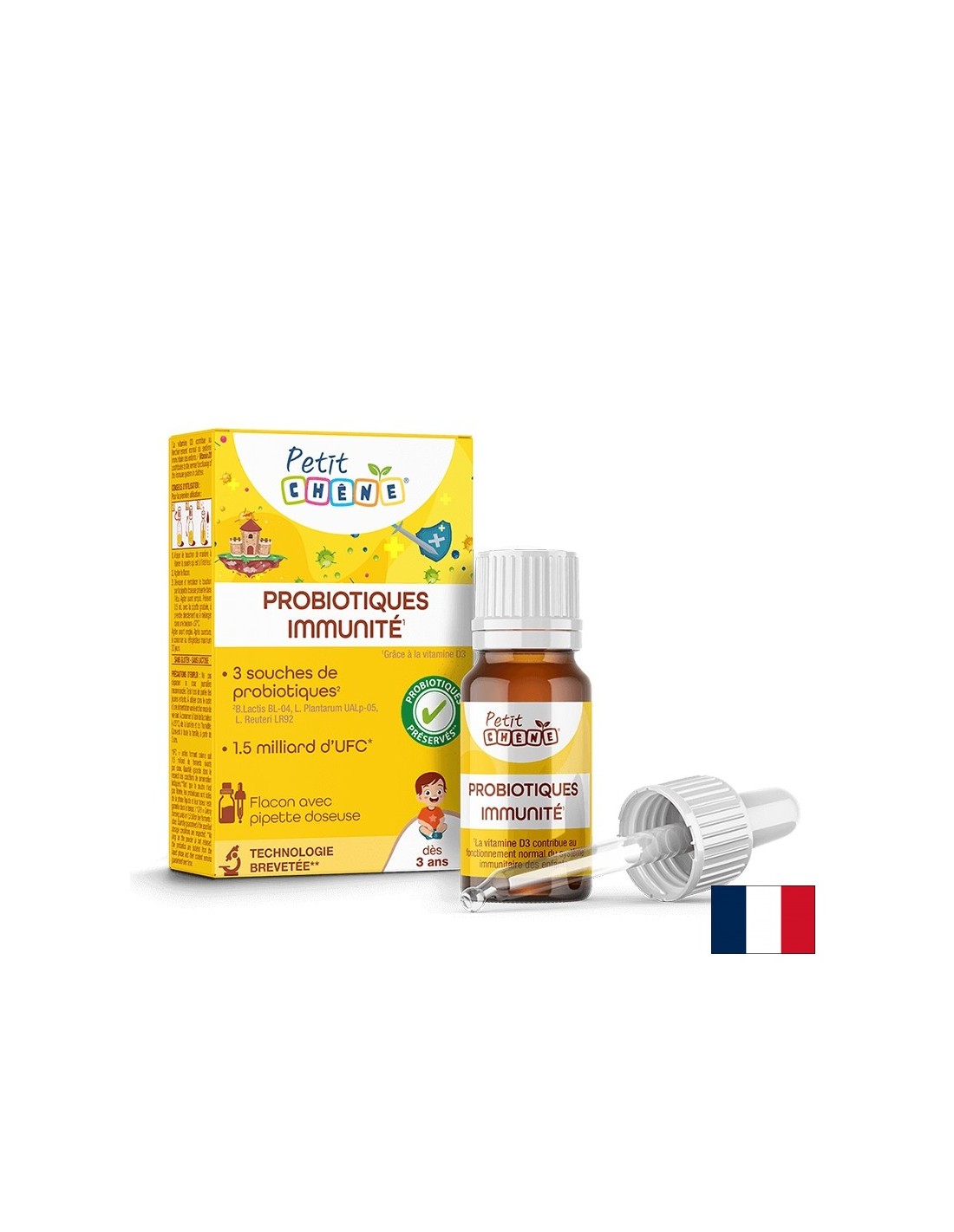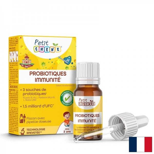 Immunity Probiotics Petit Chêne е хранителна добавка под формата на капки, създадена за деца и насочена към ежедневна подкрепа на стомашно-чревния тракт, имунната система, костите и зъбите.