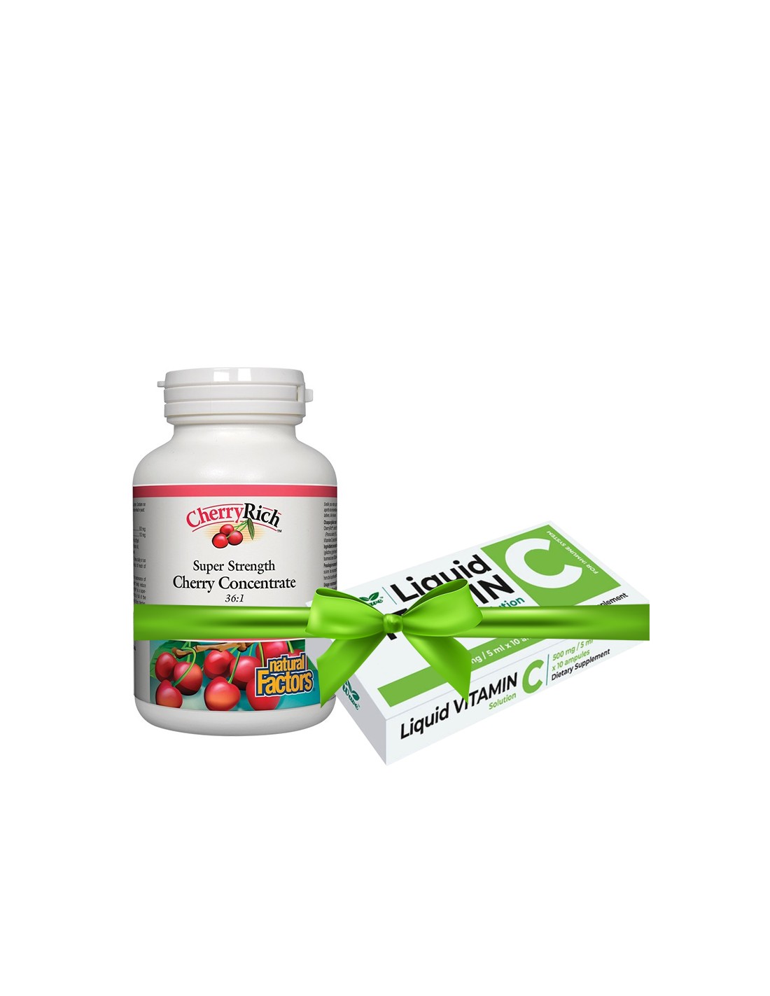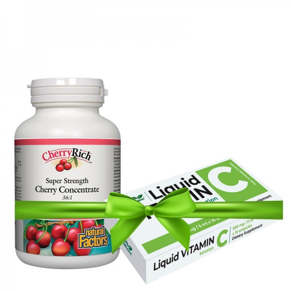 Продуктът на Natural Factors съдържа натурален концентрат от череша, патентован като CherryRich™ в комбинация с оптимално усвоимата форма на витамин С – калциев аскорбат, която не дразни стомаха. Изключително ефективно средство за облекчаване на симптомите при подагра. Спомага за намаляване образуването на пикочна киселина, понижаване на нивата й и изхвърлянето й през бъбреците.