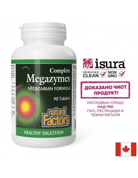 Complete Megazymes от Natural Factors съдържа набор от ключови храносмилателни ензими, които подпомагат разграждането и усвояването на хранителните вещества