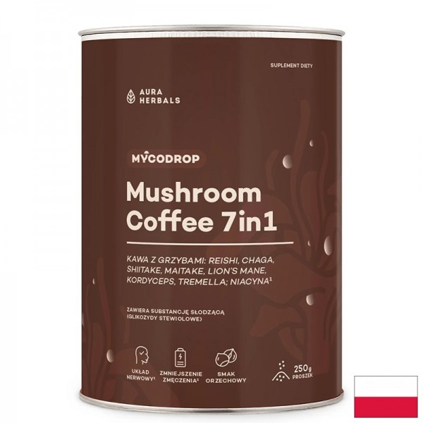Mushroom coffee 7 in 1 е функционална напитка, която съчетава 100% арабика кафе с екстракти от седем ценни гъби - рейши, чага, шийтаке, майтаке, лъвска грива, кордицепс и тремела. Формулата е създадена за ежедневна подкрепа на енергията, концентрацията и имунитета, като предлага балансирана алтернатива на традиционното кафе. Освен полезно, това кафе е и приятно за консумация благодарение на финия аромат на лешник и кремообразен вкус.