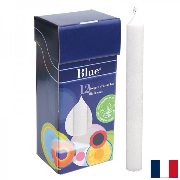 Те са едновременно практични, полезни и декоративни. Произведени са от 100% био растителен стеарин от палмово масло, добито в органично и устойчиво земеделие. Всяка опаковка съдържа 12 свещи с размери 2 х 20 см. Опаковъчната кутия е от рециклиран картон. Blue® е марка на групата Ecodis, която предлага гама от естествени, ръчно изработени свещи без парафин. Естествената суровина стеарин гарантира бавно горене, което продължава около 9 часа. Всяка свещ е с фитил от естествен памук, произведен с грижа за околната среда. Гамата свещи с блестящи и фини мраморни ефекти е направена в немска занаятчийска работилница чрез автентично ноу-хау. Восъците се охлаждат бавно и се обръща специално внимание на разформовката на свещите, за да се запази цвета и блестящия мраморен ефект.