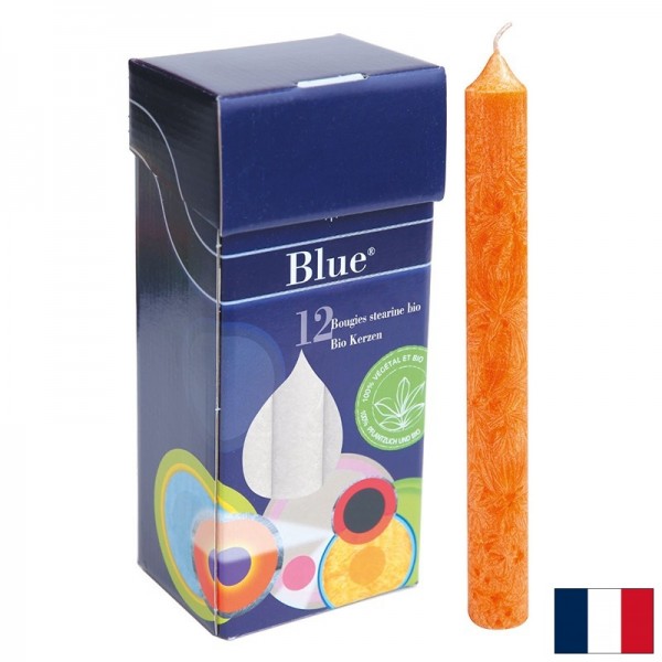 Те са част от гамата висококачествени цветни свещи, проектирани с образцови екологични стандарти от Blue® и произведени от занаятчийския производител Lichtblick (Германия). Blue® е марка за интериорен дизайн на френската компания Ecodis и предлага ръчно изработени свещи, щадящи околната среда. Те се произвеждат само от растителни, органични и естествени материали и се предлагат в минималистични опаковки, проектирани без пластмаса. Този продукт представлява 12 свещи с размери 2х20 см в кутия от рециклиран картон. Свещите Blue® са направени изцяло от растителен стеарин от органично отглеждани палми. Избирайки палмово масло, сертифицирано като органично и устойчиво (съгласно критериите на международната организация RSPO), производителят допринася за запазването на качеството на почвата, въздуха, водата, но също и за биоразнообразието и опазването на първичните гори и тяхната изключителна фауна. Използваният за оцветяване на свещите пигмент е нетоксичен. Фитилът е от органичен памук.