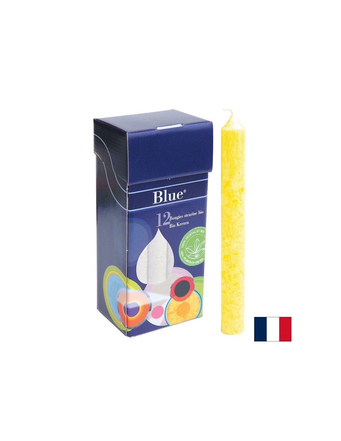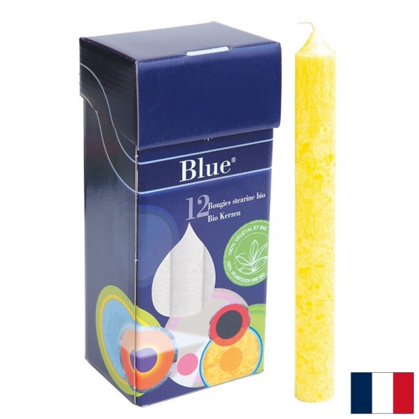 Свещите са с приятен жълт цвят, горят равномерно и ярко и създават топла атмосфера и уют в стаята. Не се деформират от температурата и стоят стабилно в свещници или директно върху гладка повърхност. Горят много красиво и са подходящи за украса на маси, празнични зали и дори веранди. Използваният за изработката на свещите стеарин е от палмово масло, добито от органично земеделие. Blue® е марка на френската компания Ecodis, специализирана в ръчното производство на свещи от растителен стеарин. Съдържащите се в свещите на Blue® етерични масла и пигменти за оцветяване са напълно естествени. Този продукт представлява 12 броя свещи с размер 2х20 см, опаковани в кутия от рециклиран картон. Високото качество е гарантирано от уникалната занаятчийска техника на изработка и характеристиките на палмовия стеарин.