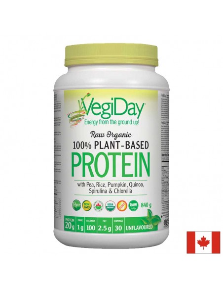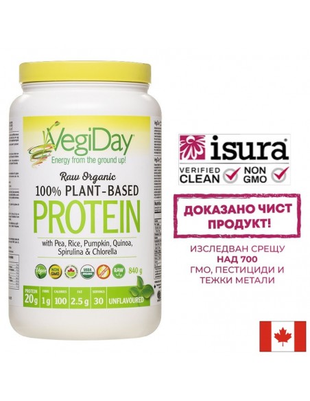 Добавката VegiDay ®Raw Organic Plant- Based Protein Unflavoured съдържа още протеини от спирулина, богати на желязо, витамини от група В и манган, а също така и от киноа, които са добър източник на магнезий, желязо и влакнини.